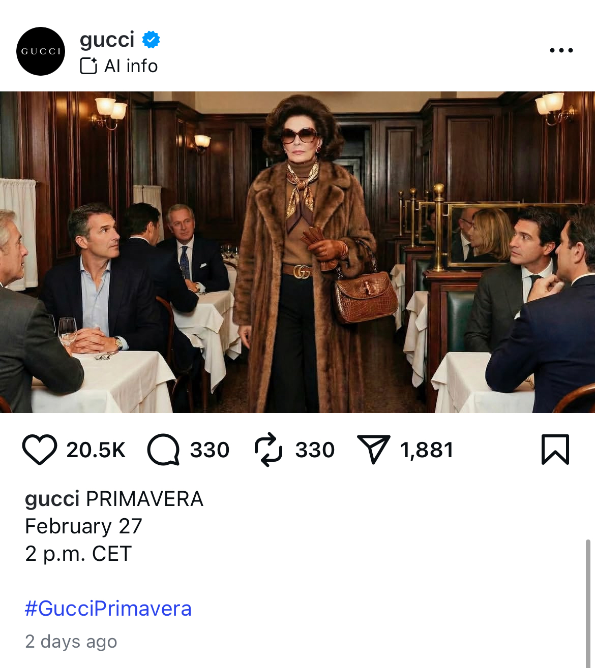 On paper, AI slashes photoshoot expenses (no models, locations, or crews needed), which could save luxury brands 50-70% on campaign production, per general marketing AI reports. For Gucci, facing sales pressure, this efficiency might appeal amid a tough market pullback from aspirational buyers. But experts warn the intangible hit to brand perception could sting more: luxury thrives on heritage, exclusivity, and human storytelling, and AI risks signalling cost-cutting over commitment to craft. Branding pros like those at Metyis see it as “creative futurism” to stay relevant with tech-savvy youth, but others, including London College of Fashion’s innovation director, note Instagram comments act as the “most honest focus group,” where AI often triggers outrage over displaced creativity.