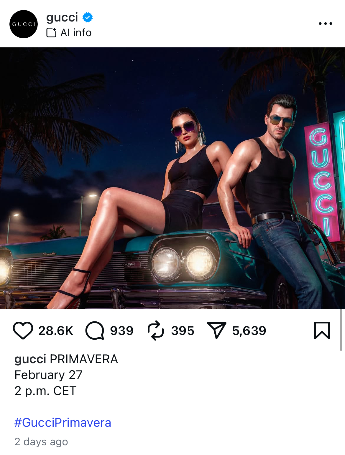 Gucci recently posted a series of promotional images on social media for its “Primavera” campaign, tied to creative director Demna Gvasalia’s debut runway show on 27 February 2026 during Milan Fashion Week. These weren’t your standard fashion shots. Instead, Gucci explicitly labelled several as “Created with AI,” featuring surreal scenes like a glamorous woman in a fur coat striding through a restaurant, models evoking Grand Theft Auto-style graphics against a Vice City-inspired backdrop, and reimagined versions of the iconic 1984 Gucci Cadillac. This marks a deliberate departure from Gucci’s traditional reliance on high-end photography, stylists, and physical sets, blending digital surrealism with the brand’s products to build hype. The images mixed AI-generated content with some traditional photography, signalling an experimental approach rather than a full pivot.
