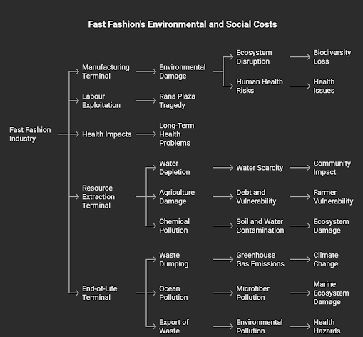 - Resource extraction terminal costs: Fast fashion’s consumption of natural resources is severe.